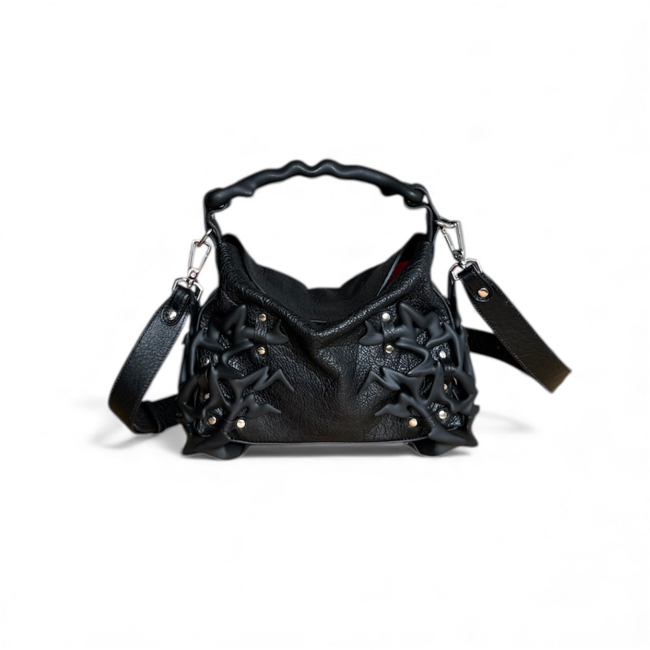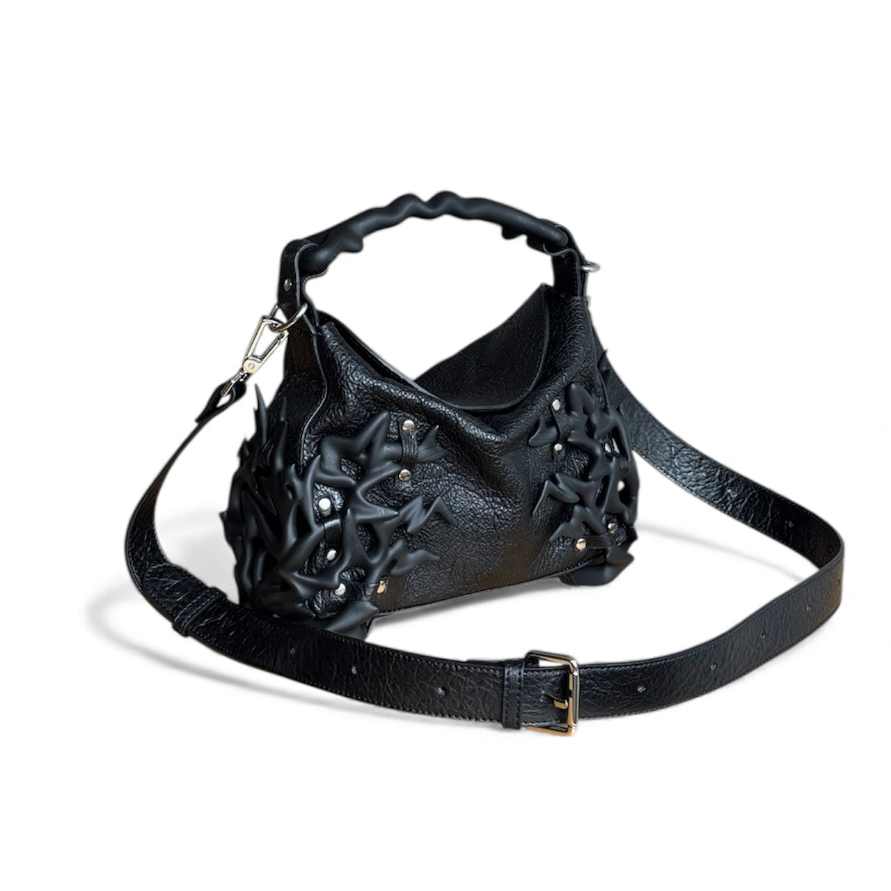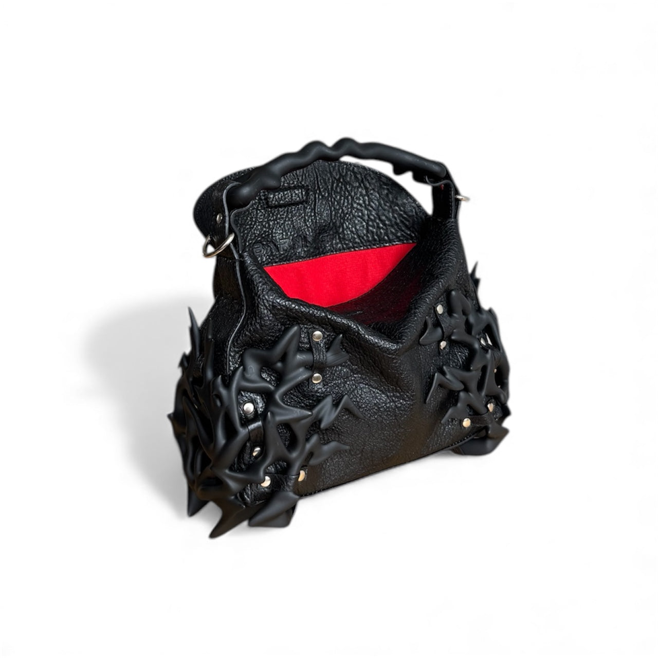 The Dream Bag is a bold leather bag featuring hand-finished 3D printed accessories for a striking, sculptural look. Each bag is crafted by hand, making every piece unique. Made with premium black leather, durable hardware, and a detachable strap, this statement handbag blends innovation and craftsmanship for those who dare to stand out. For the brave. For the different. For the dreamers